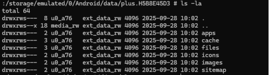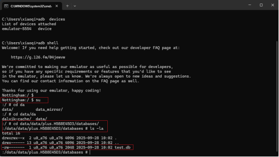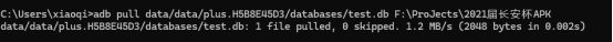 安装成后运行一下app后,使用adb连接模拟器,并获取管理员权限,成功获取到之后进入app的私有目录,由jadx我们得到该app的包名“plus.H5B8E45D3”,根据前面所说那么完成的目录为/data/data/plus.H5B8E45D3/,进入目录查看数据库文件名为:test.db,部分截图如下所示: