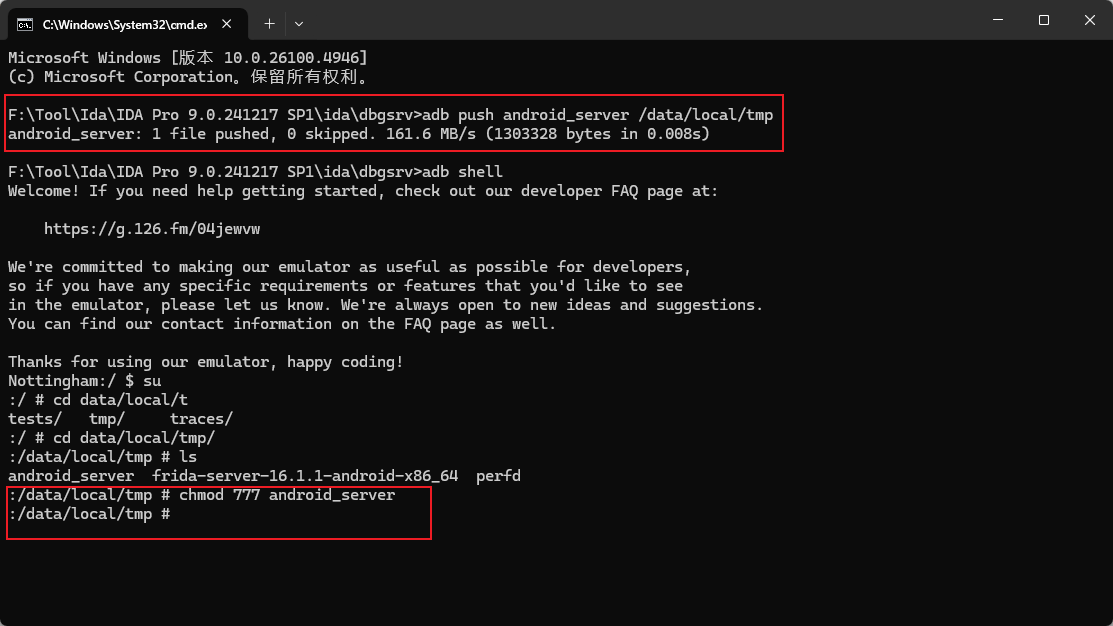 将该文件通过adb推送到模拟器的/data/local/tmp目录下赋予权限